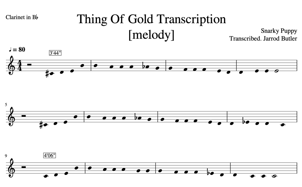 This transcription, in F# major for clarinet, contains empty bars where it’s all up to you to put in pitch and rhythm. In most bars either pitches or rhythms are given to make things a bit easier.