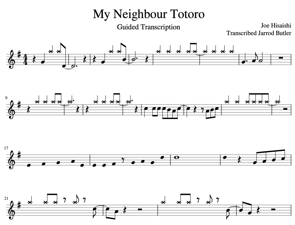 The classic melody from My Neighbour Totoro is written using both rhythm only and notes only guides. Close attention to the key and thinking about whether the notes move by step or leap will be very helpful